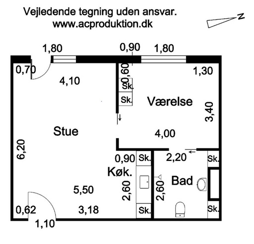 1 værelses boliger varierer mellem 2 størrelser, 36 m2 til 40 m2.